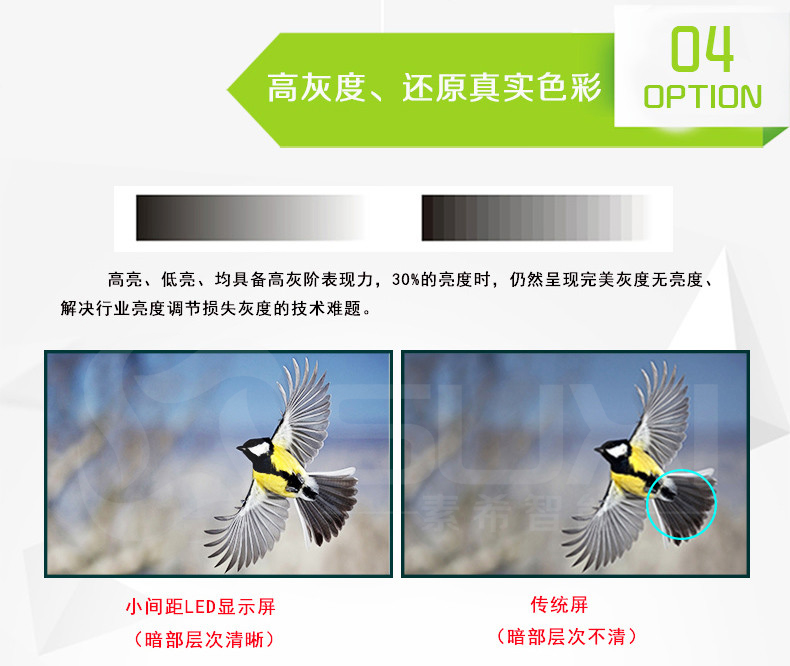1、P1.78全彩顯示屏采用四燈合一HD LED封裝技術(集成SMD+COB優(yōu)點),該技術解決墨色一致性、拼接縫、漏光、維修等問題,同時具備高對比度、高集成、易維護、耐撞擊、防串光等特點。