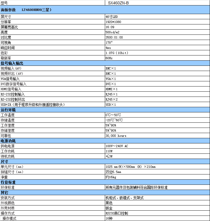 46寸3.5mm液晶拼接屏技術參數(shù):